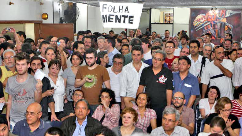 Desde os eventos de resistência à ditadura, o auditório Vladimir Herzog, no Sindicato dos Jornalistas do Estado de São Paulo, não recebia tanta gente. O ato contra “o golpismo da mídia e por mais liberdade de imprensa”, na noite da quinta (23), lotou todas as cadeiras, todas as laterais, todos os espaços do auditório, o corredor de acesso ao plenário e as escadarias.