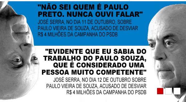 Como se jamais tivesse tratado deste assunto antes, Serra afirmou: “Evidente que eu sabia do trabalho do Paulo Souza, que é considerado uma pessoa muito competente e ganhou até o prêmio de engenheiro do ano. A acusação contra ele é injusta. Ele é totalmente inocente. Nunca recebi nenhuma acusação a respeito dele durante sua atuação no governo”. Aos eleitores, restou uma dúvida: em qual Serra o eleitor deve acreditar? Naquele que diz não conhecer o engenheiro ou naquele que elogia o profissional acusado pelo próprio PSDB de desviar R$ 4 mihões da campanha? As idas e vindas de Serra suscitam outras questões relevantes às vésperas do segundo turno das eleições presidenciais: por que o tema lhe causou tanto constrangimento? O que Serra teria a temer para, em menos de 24 horas, se expor publicamente emitindo opiniões tão distintas sobre o mesmo tema?