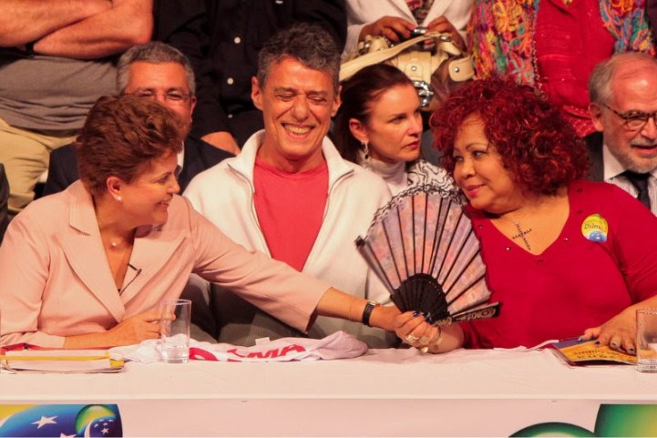 Chico Buarque, de volta à militância, e Niemeyer, aos 102 anos e de cadeira de rodas, não eram as únicas presenças de destaque. As cantoras Alcione e Margareth Menezes foram as primeiras a chegarem, a exemplo da sambista Lecy Brandão, eleita deputada estadual em 3 de outubro pelo PCdoB-SP. Zeca Pagodinho não foi, mas mandou dizer que está com Dilma. Beth Carvalho, empolgada, fez uma versão de um dos sambas mais famosos de Zeca. No lugar do refrão “Deixa a vida me levar”, improvisou “Deixa a Dilma me levar, Dilma leva eu”.