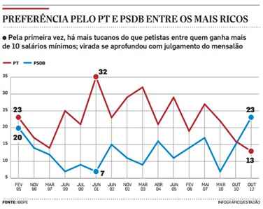 Segundo o Estadão, o julgamento do mensalão, ocorrido no ano passado, seria a principal explicação para o declínio da popularidade do PT, embora todos os partidos tenham sofrido desgaste. O argumento ganha força quando se analisa o segundo gráfico, que mostra a evolução da preferência partidária junto às elites brasileiras.