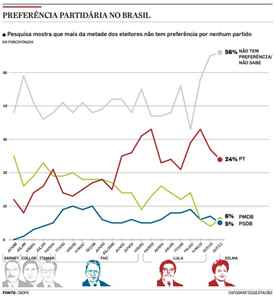 Desde junho de 2001, quando 35% do topo da pirâmide se disseram simpatizantes, o PT vinha com viés de baixa nesse extrato. (…) Quando Dilma Rousseff assumiu sua candidatura à Presidência, no começo de 2010, a penetração petista na elite econômica já estava reduzida a 22%. Ao fim da campanha eleitoral, sete meses depois, a taxa havia caído para 16%. Hoje é de 13%. Apesar disso, a perda de simpatia do PT nada tem a ver com Dilma.