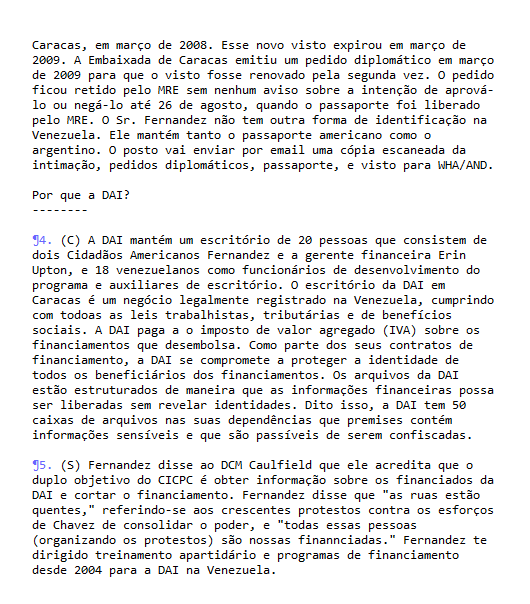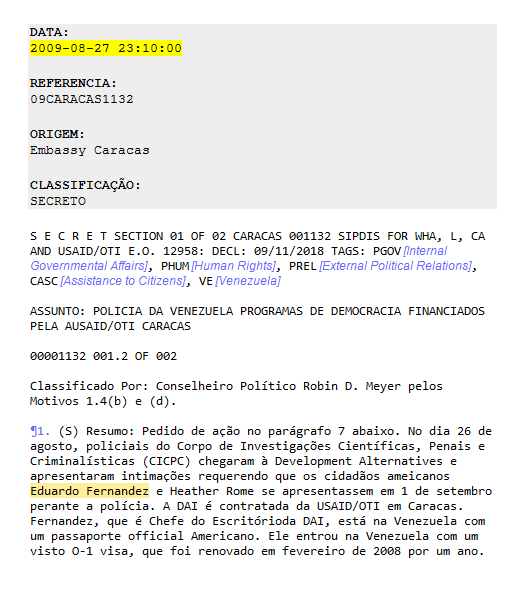 Duddy também queria saber “o que a DAI deveria fazer com suas 50 caixas de documentos, alguns dos quais contém nomes das pessoas que dirigem as organizações financiadas pela DAI”. E, por fim, pergunta se a embaixada deveria ajudar Fernandez a fugir: “Se o Sr. Fernandez é considerado alguém que trabalha em nome dos EUA, ele deve permanecer no país ou tentar sair da Venezuela antes da entrevista com a polícia em 1 de setembro?”.