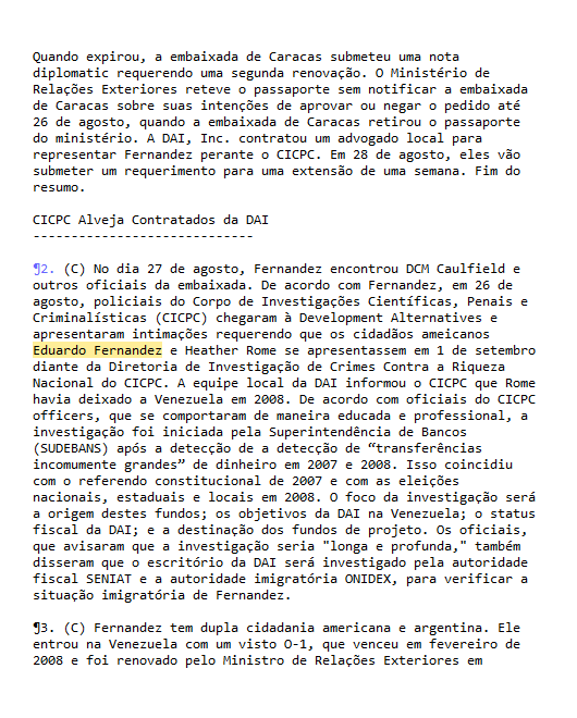 Fernandez estava em Caracas com um visto oficial cedido a pedido da diplomacia americana, porém vencido desde março de 2009. A embaixada pedira sua renovação, mas o passaporte foi retido sem explicações pelo Ministério de Relações Exteriores até o final de agosto. “Fernandez não tem outra forma de identidade venezuelana. Ele continua com seus passaportes americano e argentino”, escreveu o embaixador, pedindo orientações sobre o caso ao Departamento de Estado americano, então comandado por Hillary Clinton.