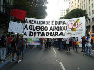 Nesta quinta (12), mesmo dia em que se realizara a greve nacional, a população aproveitou o ensejo das mobilizações para pedir também pela democratização dos meios de comunicação. E uma das maneiras encontradas para fazer essa reivindicação foi protestar em frente a um dos grandes monopólios da mídia brasileira: a Rede Globo.