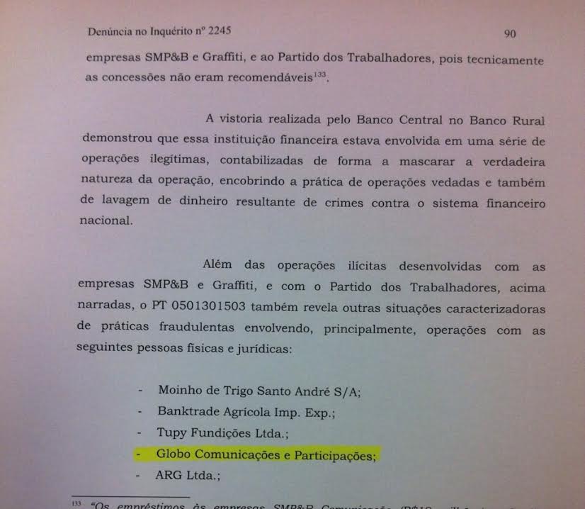 A denúncia do procurador-geral Antônio Fernando Barros e Silva de Souza diz que, além das operações ilícitas envolvendo o PT e o Banco Rural, a investigação revelou práticas fraudulentas envolvendo o mesmo banco e dezesseis pessoas físicas e jurídicas, entre elas a Globo Comunicações e Participações.