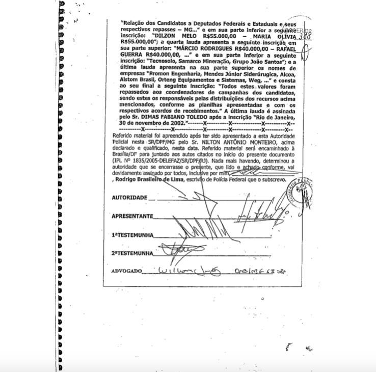 Em 2010, um advogado que trabalhou tanto para o lobista Nílton Monteiro quanto para a Samarco prestou um depoimento considerado bombástico, em que confirmou possuir gravações que comprometiam a empresa Samarco e integrantes do primeiro escalão do governo de Minas, entre os quais o próprio governador Aécio Neves.