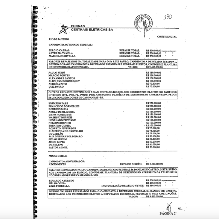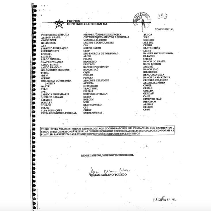 Nesta lista , estão fornecedores diretos da estatal Furnas e empresas com as quais o então diretor de Planejamento, Engenharia e Construção, Dimas Toledo, mantinha contatos, como operador que administrava os interesses de seus políticos protetores, rol em que Aécio Neves era o destaque.