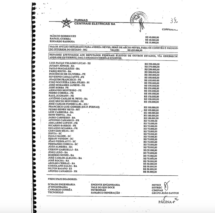 No final da página 4 e na página 5, estão relacionados os nomes de 101 empresas, as que deram dinheiro para financiar os candidatos. É o que se poderia chamar de a lista dos corruptores.