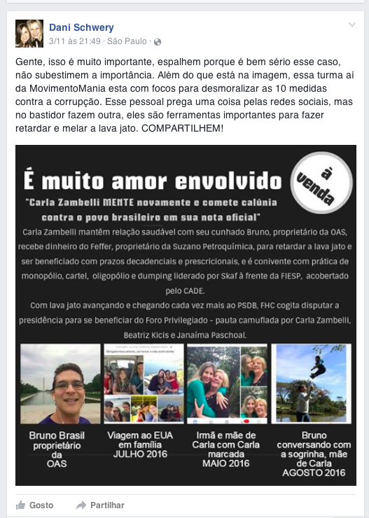 “Não deixem não, amiguinhos, esfreguem na carinha deles que o bonitão da família da Carla, o cunhadinho querido, com malas de dinheiro é o DONO da OAS e queria contar com a morosidade da justiça e ministros de bolso para livrar a cara dos companheiros, o que a Carla bota na prática alinhando e aparelhando os protestos aos interesses das empresas ligadas a lava jato, como a Suzano, tendo os Feffers como seu patrocinador – família que está aparelhando a FIESP – contando com a ajudinha do industrial que não tem indústria, o Skaf, que tem seu filho casado com a fefferlandia”, escreveu Schwery nas redes sociais, revelando que ali todo mundo se conhece, tem relacionamento muito próximo. O ‘cunhadinho’ de Carla Zambelli é Bruno Brasil, da empreiteira OAS.