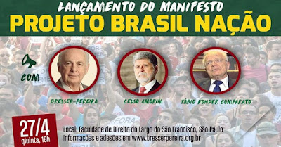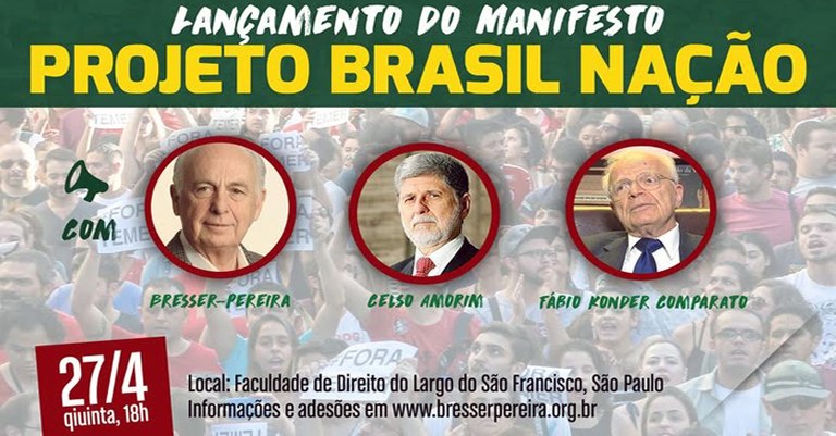 O manifesto do Projeto Brasil Nação é uma iniciativa do professor Luiz Carlos Bresser-Pereira que apresenta "uma alternativa viável e responsável para o Brasil" e será lançado nesta quinta-feira, dia 27/04, a partir das 18 horas, no auditório da Faculdade de Direito da USP, no Largo São Francisco, centro de São Paulo.