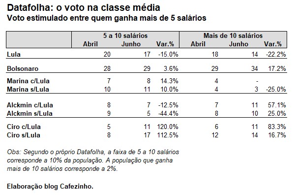 O Datafolha estratifica as intenções de voto em 4 faixas de renda. Considerei como “classe média” apenas as duas últimas colunas: eleitores com renda familiar entre 5 e 10 salários, que formam mais ou menos 10% da população, e com renda familiar acima de 10 salários, que formam 2%, segundo os critérios usados pela própria pesquisa.