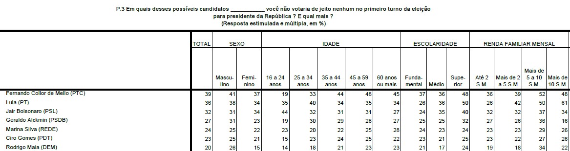 Entre quem ganha mais de 10 salários, a rejeição a Lula é de 61%, bem maior que a de Collor, que tem 48%; Ciro tem rejeição de 26% nessa faixa de renda.