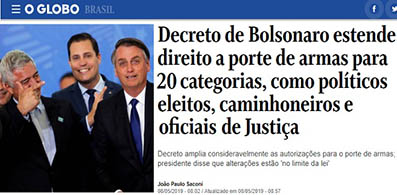 No jornal O Globo, a nua e crua realidade do que foi assinado ontem por Jair Bolsonaro: são mais 1 milhão de pessoas autorizadas a carregar armas nas ruas e estradas do país.